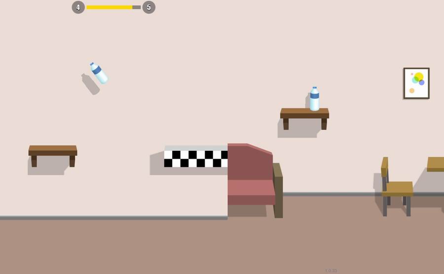 Remember the famous flash mob with attempts to flip a bottle so that it becomes straight on the first try? We can not pass by the worldwide trend, so presents to your attention Bottle Flip, where you become a contestant and toss a bottle. The point is to toss the container so that it lands on flat objects and does not fall on the floor. It's an interesting start. More to come because you'll get cool coins for your completed levels. Then, it's time to figure out the rules.